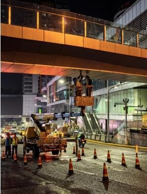 天橋位于商業區,天橋上下人流、車流量較大,且天橋外側加裝了鋁板裝飾層,無形中為現場檢測工作帶來了難度。為盡快完成本次檢測,同時減少現場檢測工作給游客及交通帶來的影響,本次檢測選擇在夜晚進行。我司組織了在檢測、鑒定領域具有豐富經驗的專家及檢測人員進駐現場,在最短時間完成了檢測方案編寫、天橋計算分析、交通占道方案審批、現場檢測工作準備以及橋梁外觀檢查、靜載和動載試驗以及欄桿推力試驗,圓滿完成檢測任務,為天橋結構的安全提供了有力的技術保障,為橋上打卡游客的人身安全保駕護航。