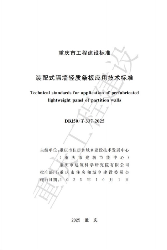 近日,由重慶設計集團所屬子企業重慶市建筑科學研究院有限公司(以下簡稱“市建科院”)聯合重慶市住房和城鄉建設技術發展中心編制的重慶市工程建設標準《裝配式隔墻輕質條板應用技術標準》(DBJ50/T-337-2025)通過了重慶市住房和城鄉建設委員會的審批并發布,將于2025年10月1日起開始實施。