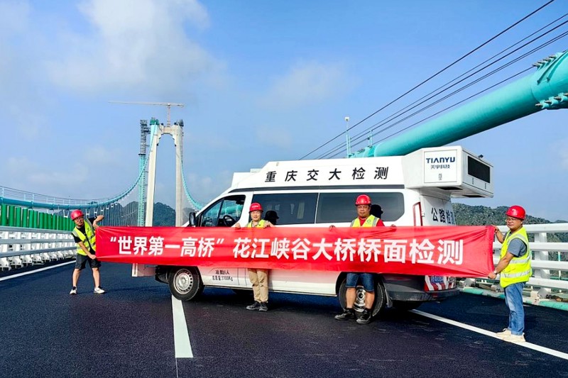 在此次挑戰(zhàn)世界之巔的檢測任務(wù)中,市建科院所屬重慶交大建設(shè)工程質(zhì)量檢測中心有限公司檢測團隊將“檢測公正、服務(wù)及時、方法科學(xué)、誠實守信、遵規(guī)守紀”的質(zhì)量方針貫穿于項目全生命周期,為大橋橋面檢測任務(wù)量身定制了科學(xué)周密、前瞻精準的技術(shù)方案。在項目實施過程中,檢測團隊?wèi){借深厚的技術(shù)實力攻克了因橋面超高、跨度極大帶來的系列“高精尖”檢測難題。他們對每一次檢測質(zhì)量嚴格把關(guān),讓檢測數(shù)據(jù)精準、及時、科學(xué)地呈現(xiàn)在檢測報告上,確保了所有檢測指標(biāo)均符合大橋設(shè)定與行業(yè)規(guī)范。